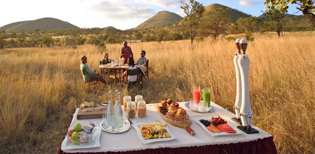 精致的杯碟、讲究的摆盘,上乘的烹饪都会像是变戏法一样出现在荒野上,还有远处踱着步的长颈鹿、呆萌呆萌的羚羊斑马为你们的这一餐助兴。